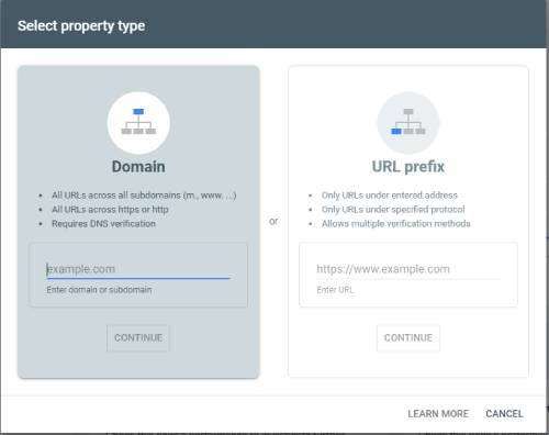 بعد از کلیک روی Add a Property، صفحه ای باز میشه که باید روش اتصال سایتت به گوگل سرچ کنسول رو انتخاب کنی. دو روش اصلی هست: