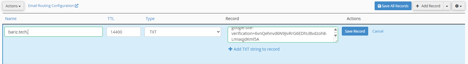 بعد از انتخاب گزینه Domain و ادامه مراحل، گوگل یه کد متنی (TXT record) بهت میده که باید اون رو کپی کنی. این کد باید توی بخش تنظیمات DNS هاست یا دامنه ات وارد بشه. برای این کار وارد پنل مدیریت هاست یا دامنه ات بشو، بخش DNS Management یا تنظیمات DNS رو پیدا کن و کد TXT که از گوگل گرفتی رو توی قسمت مربوط به رکوردهای DNS اضافه کن. این کار تایید می کنه که مالک سایت هستی و گوگل اجازه میده اطلاعات سایتت رو ببینه.